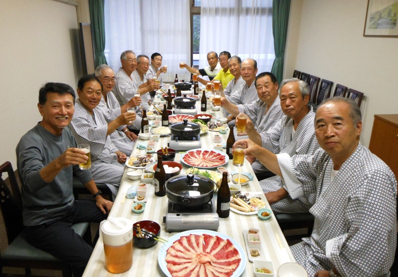 ≪前夜祭≫ 恒例となった前泊ハーフプレイ付紫峰会は初日、ハーフの練習ラウンドで各自コンディションの確認を終えました。5時半からはお楽しみの前夜祭がスタート、この懇親会は県南・県北の交流の場であることから西郷支部長と高石さんも参加し13名で賑やかに乾杯!すき焼き鍋に舌鼓を打ちながら酒を酌み交わし、いつものように昔話に花が咲き、深夜まで語り合いました。各自持ち寄った銘酒もあっという間に飲み干したためか?二日酔いで翌日のプレイに影響が出た方もいるほどでした。 | |
